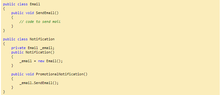 Notificationclass totally depends onEmailclass, because it only sends one type of notification. - If we want to introduce any other like SMS then? We need to change the notification system also. And this is called tightly coupled.
