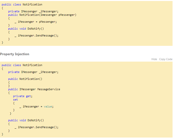 StillNotificationclass depends onEmailclass. Now, we can use dependency injection so that we can make it loosely coupled. There are 3 types to DI, Constructor injection, Property injection and method injection.