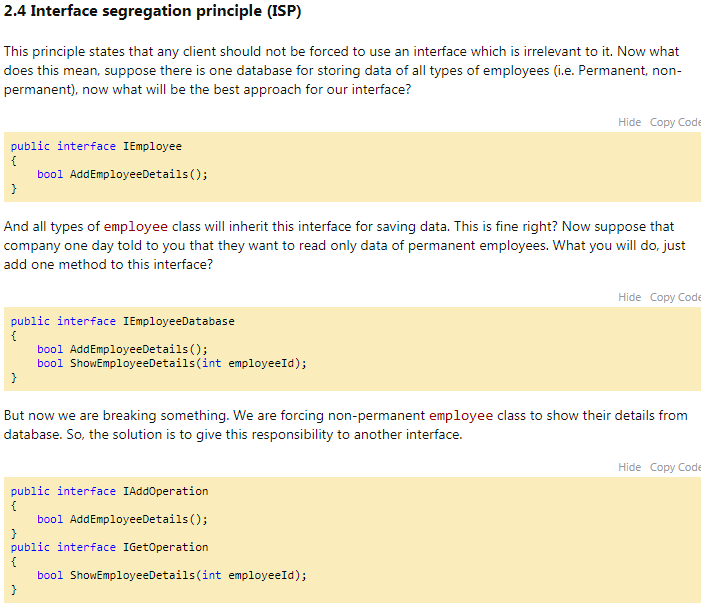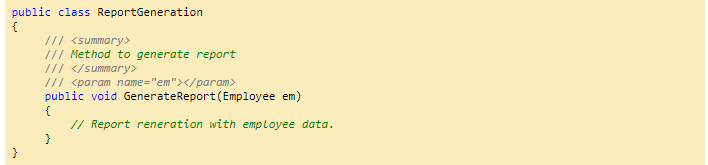 Employee’ class is taking 2 responsibilities, one is to take responsibility of employee database operation and another one is to generate employee report. Employeeclass should not take the report generation responsibility because suppose some days after your customer asked you to give a facility to generate the report in Excel or any other reporting format, then this class will need to be changed and that is not good.- So according to SRP, one class should take one responsibility so we should write one different class for report generation, so that any change in report generation should not affect the ‘
